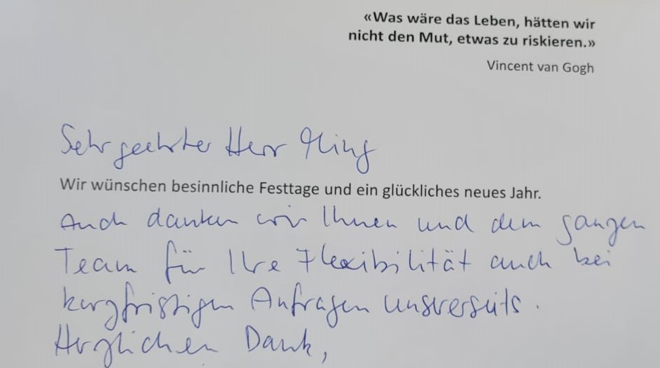 Auf dieser Seite finden Sie ausgewählte Auszüge aus den Karten und Rückmeldungen, die uns erreicht haben. Sie sind Ausdruck einer wertvollen Partnerschaft.