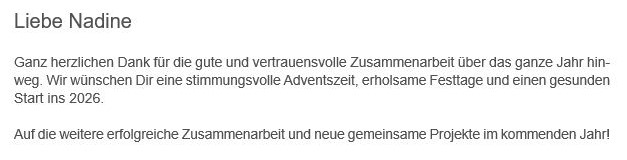 Zum Jahresende durften wir Karten, Nachrichten und persönliche Worte von unseren Kundinnen und Kunden entgegennehmen. Jede einzelne Rückmeldung berührt uns — denn sie zeigt, dass unsere Arbeit wirkt: zuverlässig, menschlich und mit Herz.